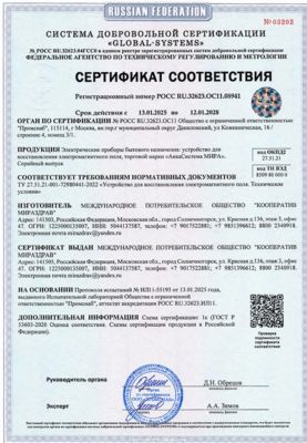 Генератор гармонизирует окружающее пространство и водные среды в нем. Замечено улучшение качества воды в водопроводе не только там, где работает устройство, но и в соседних квартирах. Размещенные на генераторе продукты — вода, фрукты — улучшают свои свойства, дольше хранятся.